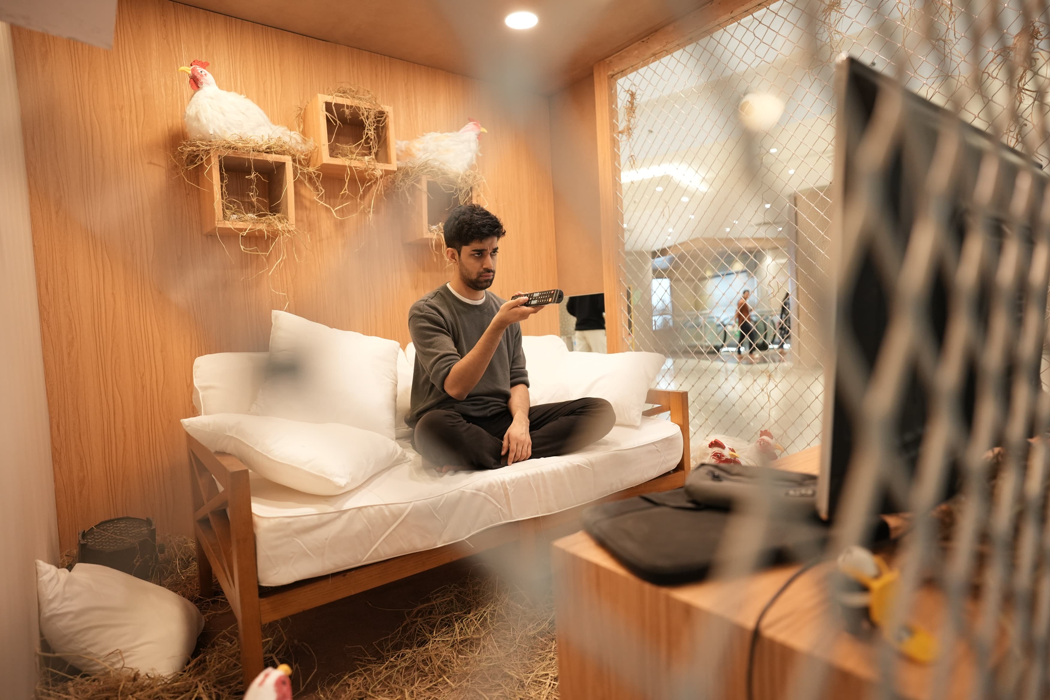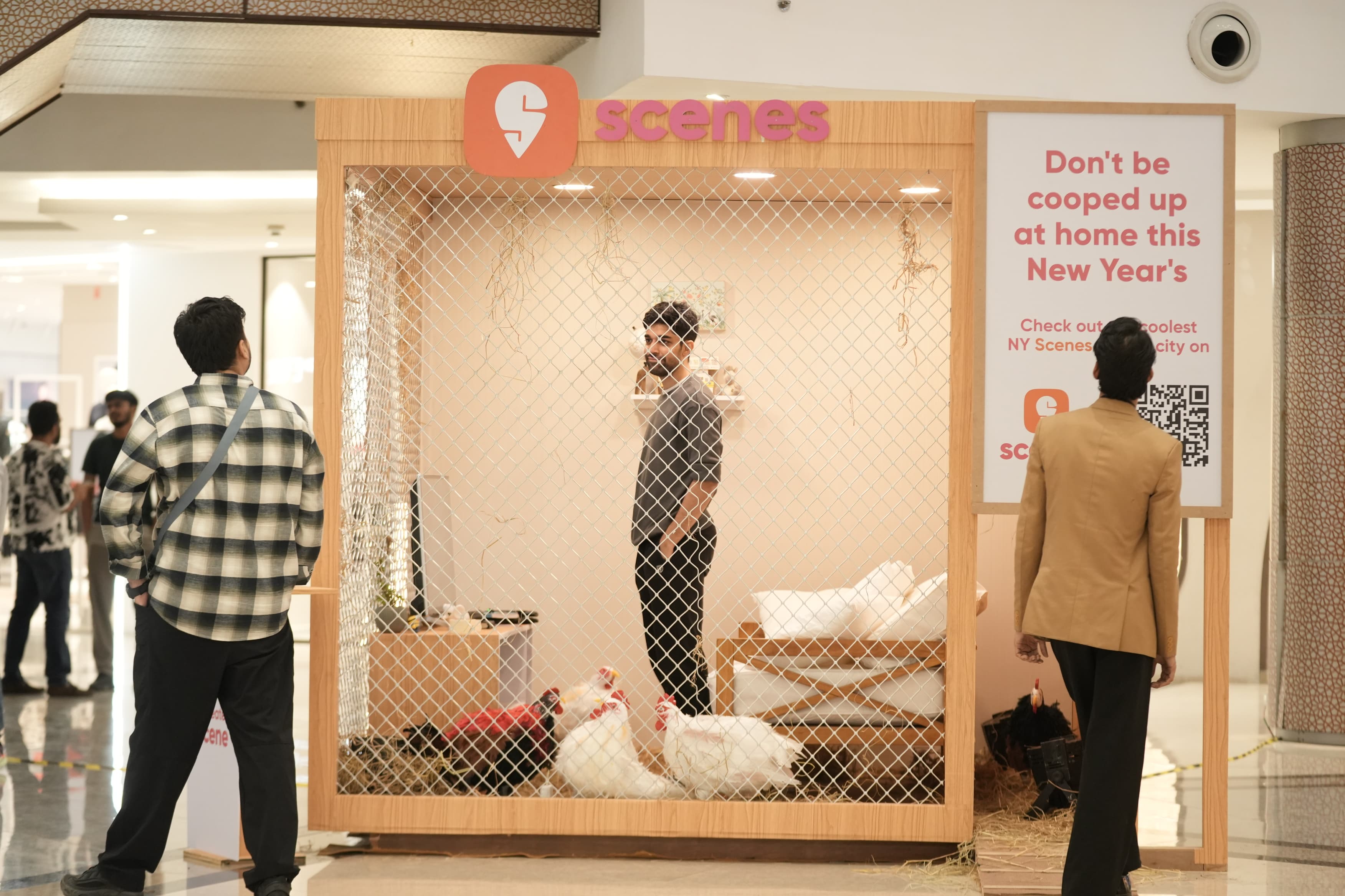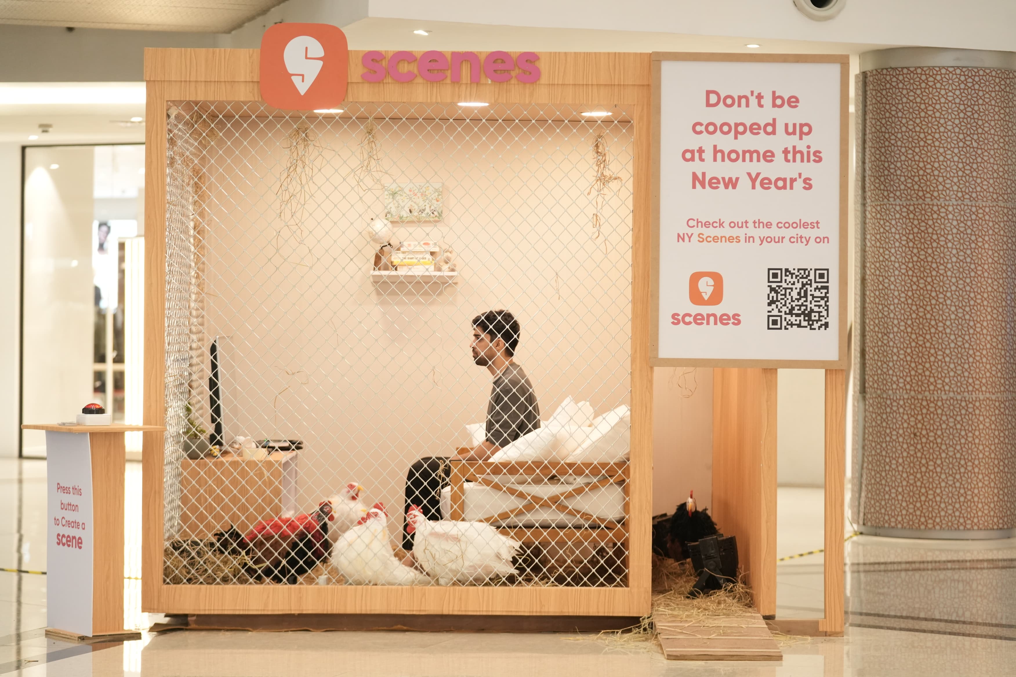 Swiggy Scenes is an events discovery platform on the Swiggy app. Unfortunately, it's not half as popular as its competition. But with New Year's around the corner, we wanted people to give Scenes a shot. To do this, we placed an actor in a giant chicken coop in a mall. And like most of us, he spent his entire day just watching TV, sleeping, and lazing around - in short, not living his one wild and precious life to the fullest. A message on the outsiden of the coop asked people not to stay cooped up on NYE and discover Scenes on Swiggy instead.